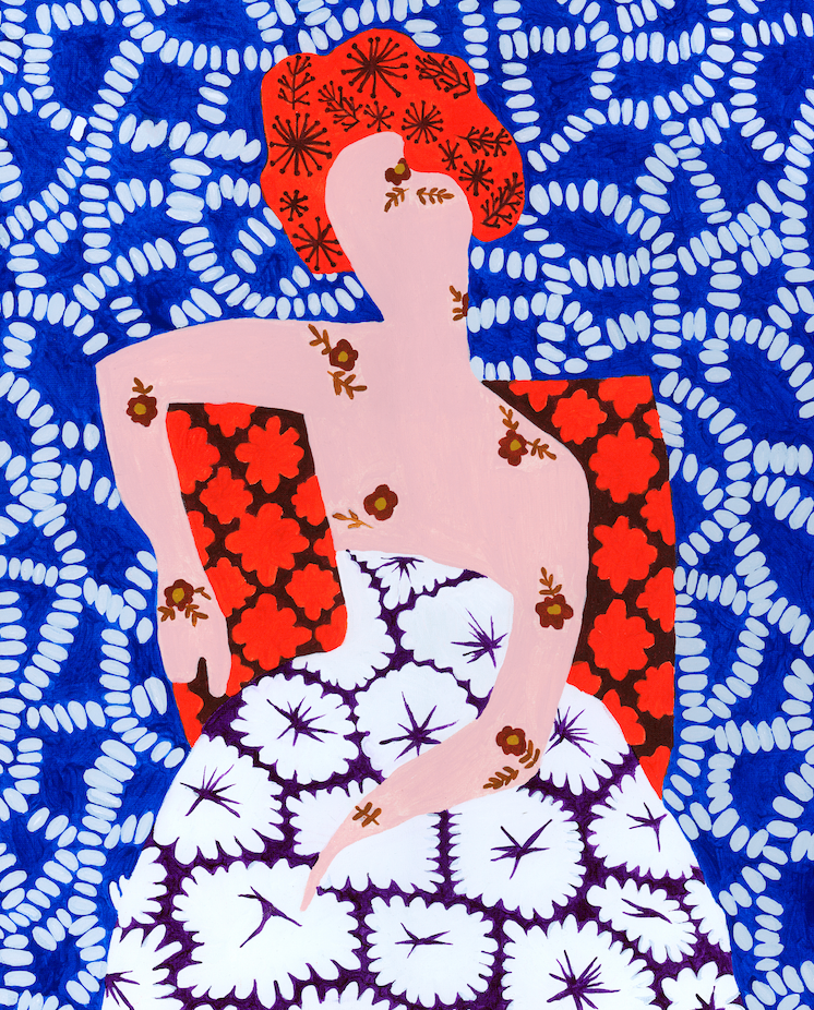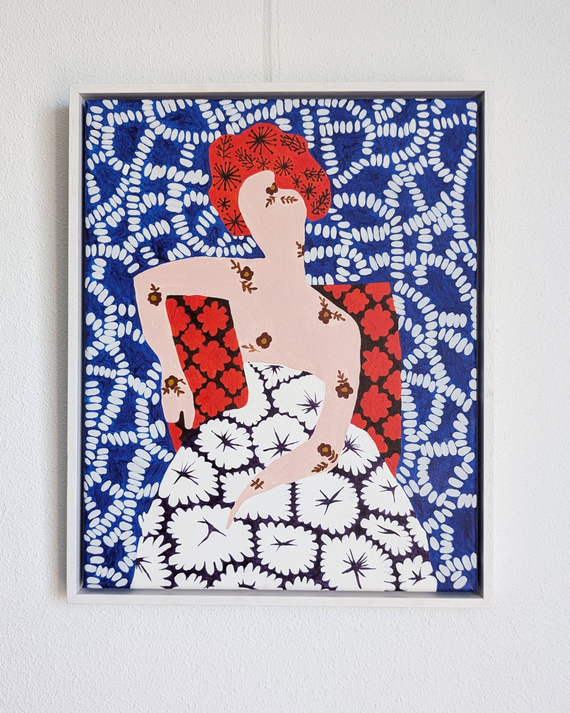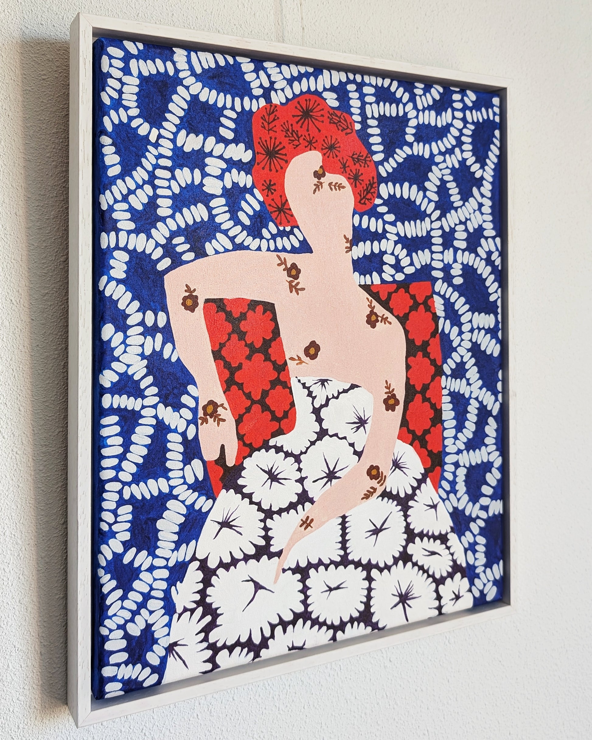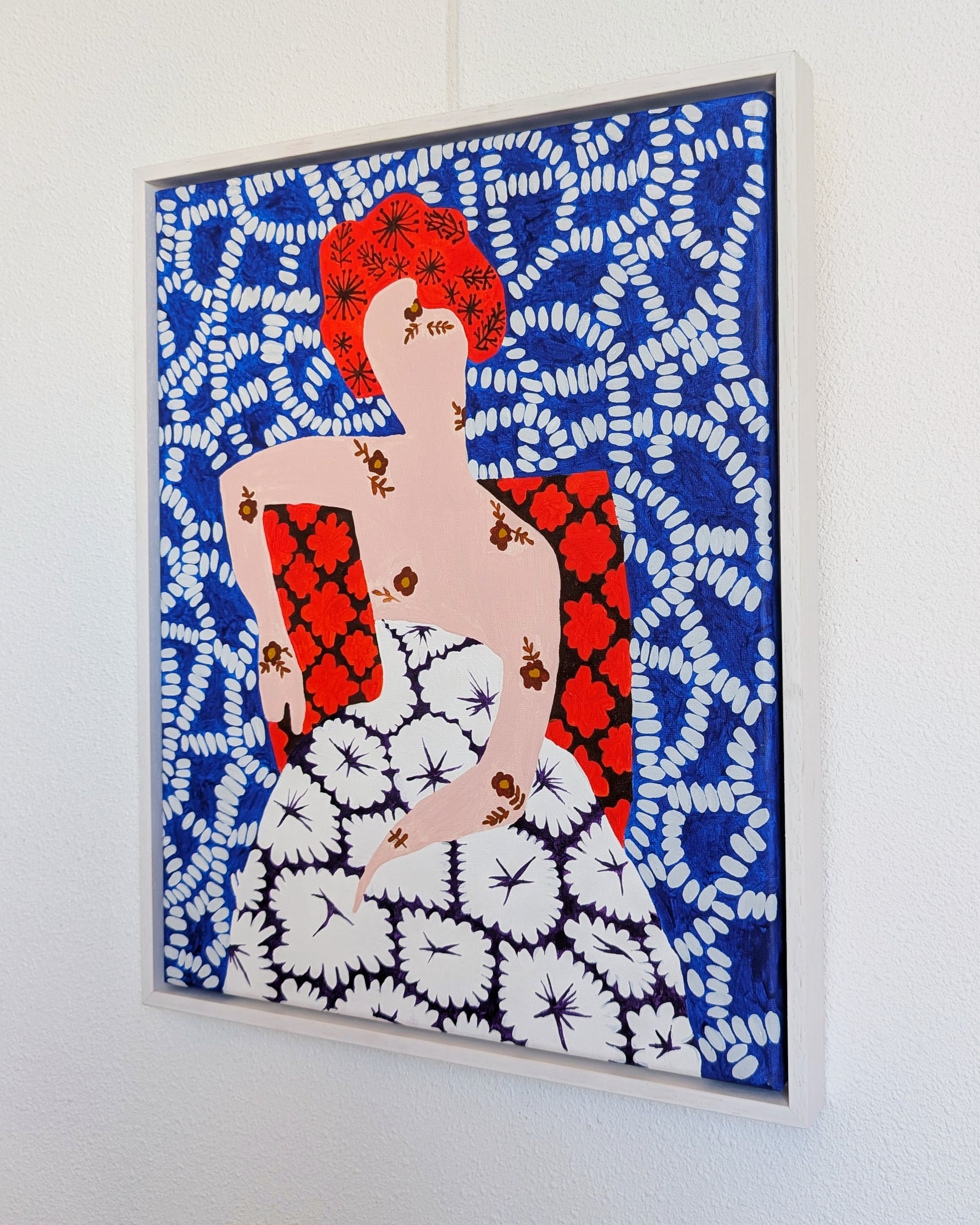 The canvas comes alive with intricate patterns each swirl and line meticulously crafted to symbolize the endless beauty of life's journey. Her fiery orange hair perfectly complements the orange cushion she leans upon, creating a symphony of warm, inviting colors.