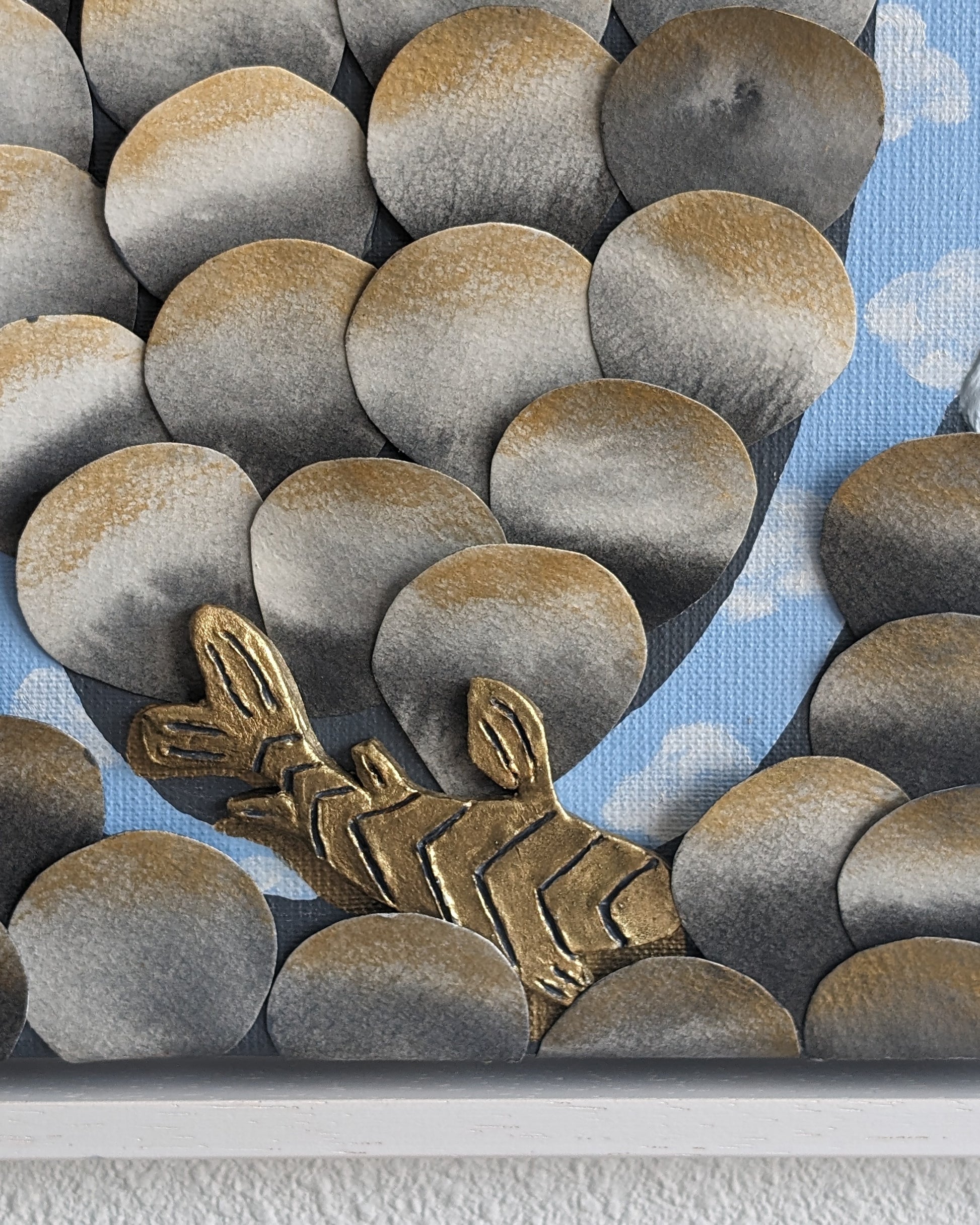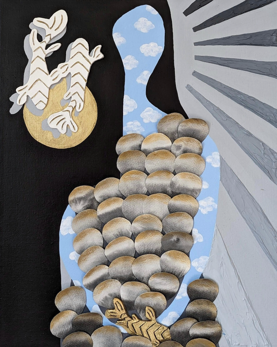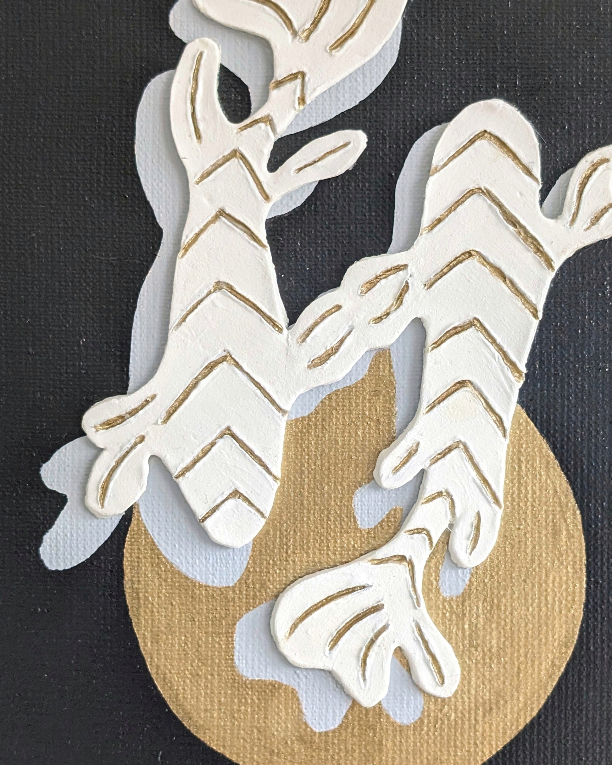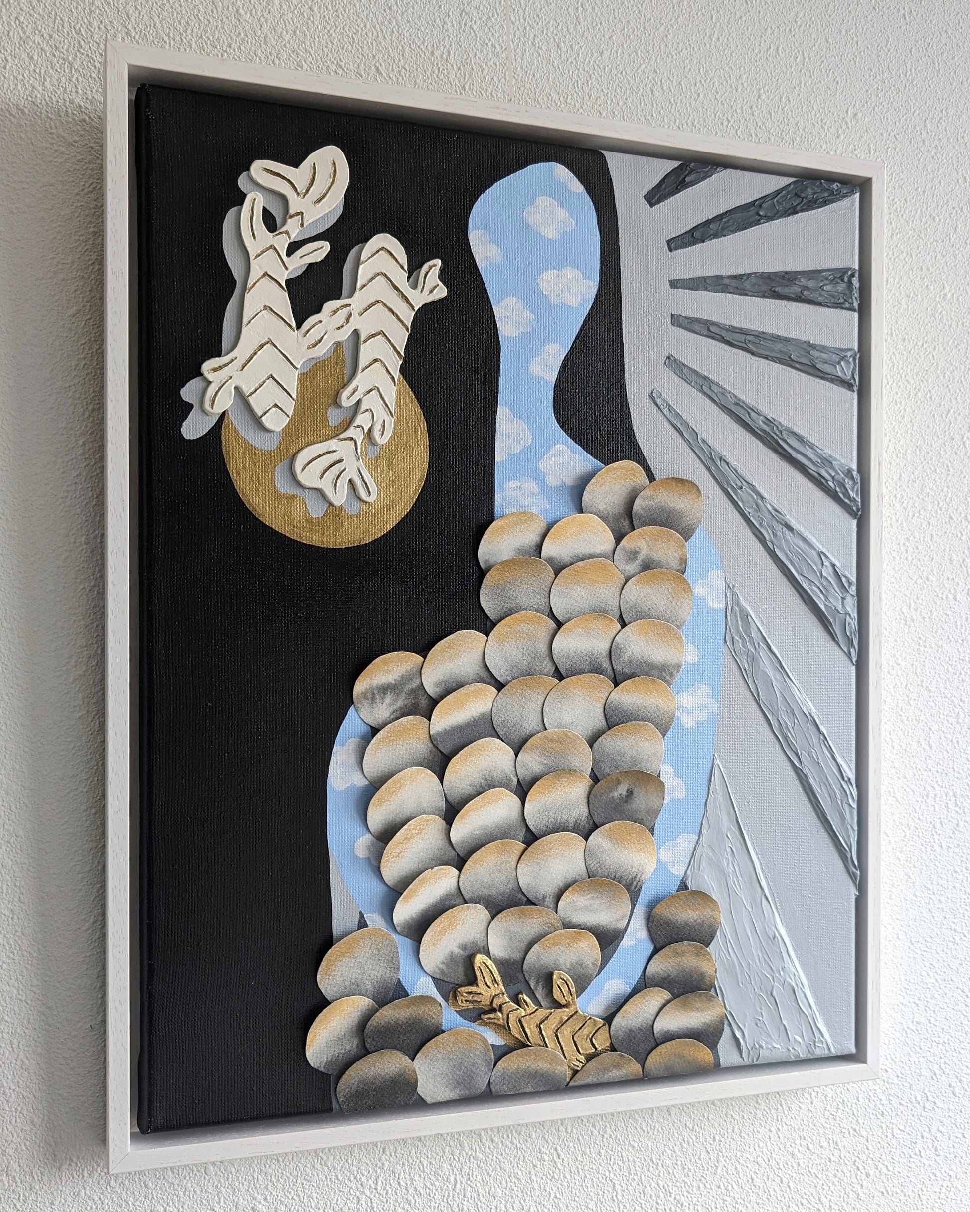 The artwork's other half is an ode to dawn, crafted with texture paste to create lines that signify the emergence of light, a promise of new beginnings. Holding a golden fish, she embodies prosperity and good fortune, its scales shimmering with genuine gold leaf, each detail a testament to meticulous craftsmanship.