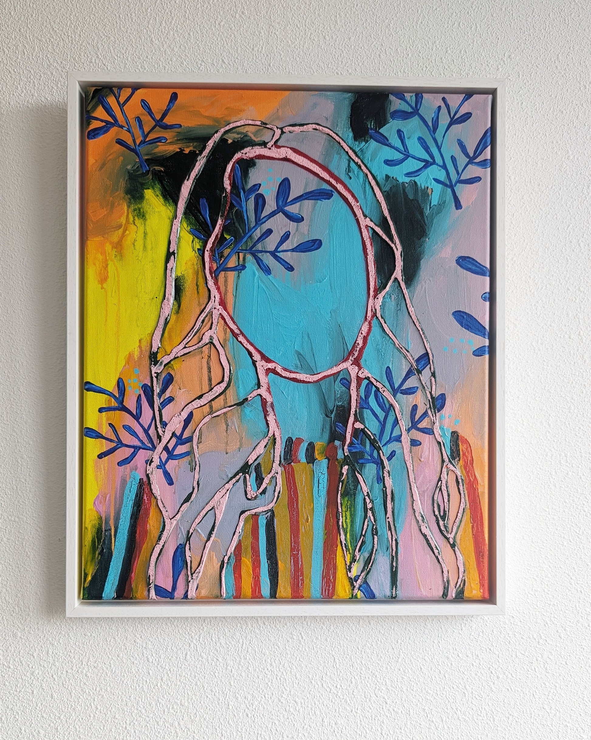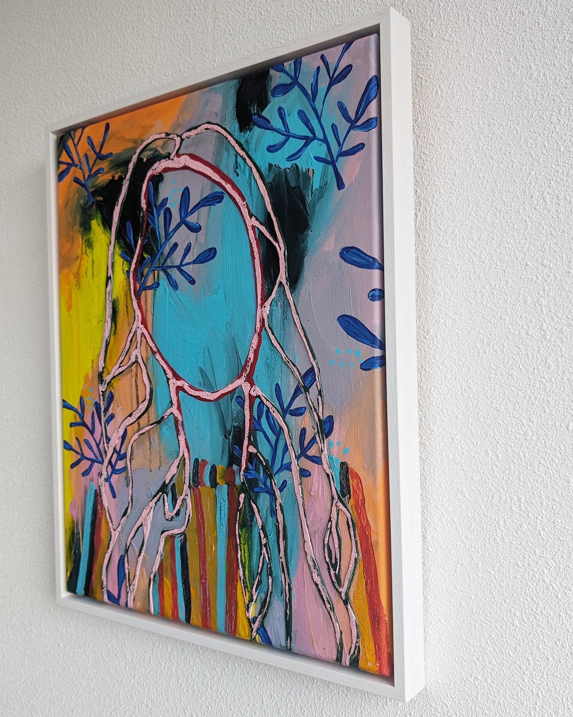 The painting portrays a girl whose silhouette is left to the viewer's imagination, set against a contrasting abstract background. A pattern of blue flower petals symbolizes the natural cycle of life - birth, growth, and death - and the unchanging essence of beauty within it.